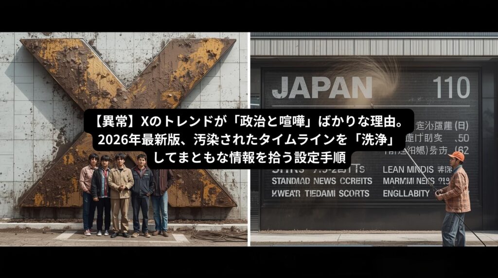 【異常】Xのトレンドが「政治と喧嘩」ばかりな理由。2026年最新版、汚染されたタイムラインを「洗浄」してまともな情報を拾う設定手順