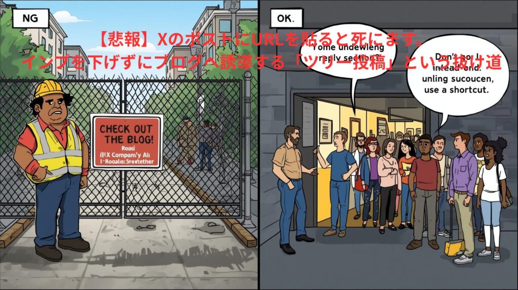 【悲報】XのポストにURLを貼ると死にます。インプを下げずにブログへ誘導する「ツリー投稿」という抜け道