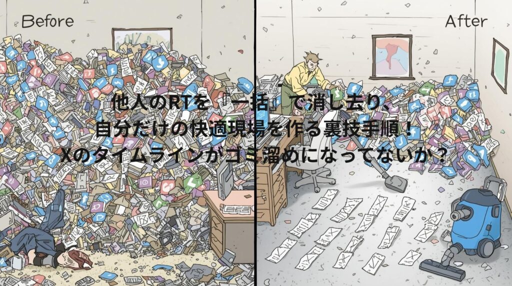 他人のリツイート(RT)『一括』消し去り、自分だけの快適現場を作る裏技手順!Xタイムラインがゴミ溜めになってない?