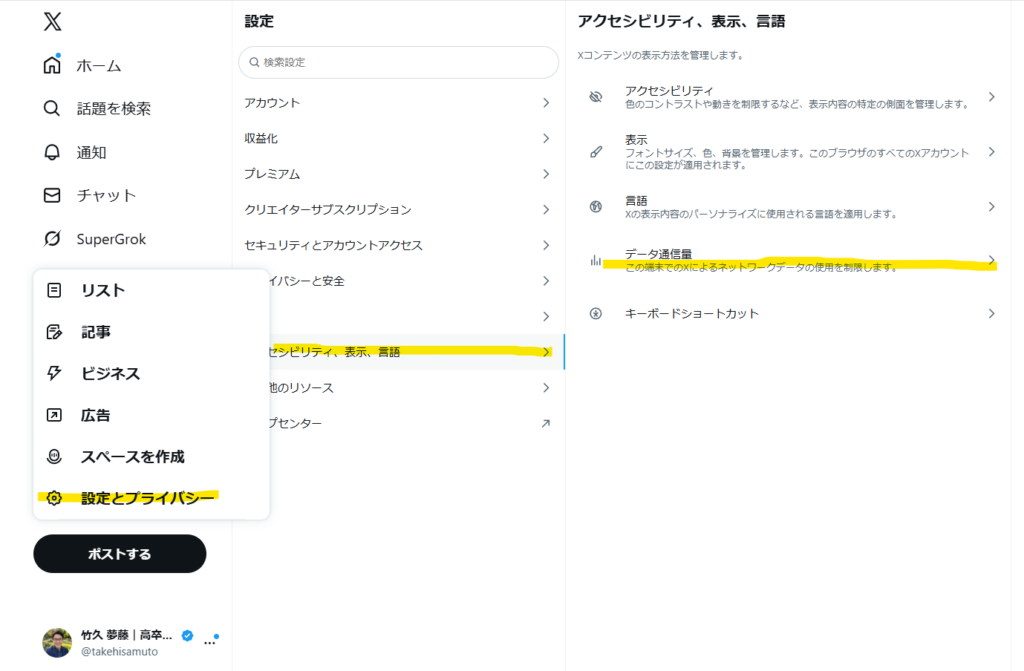 【原因B:データセーバー設定】 Xアプリには、通信量を節約するために「あえて画像を読み込まない」設定があります。これが勝手にONになっている(またはアップデートで設定が変わった)可能性があります。